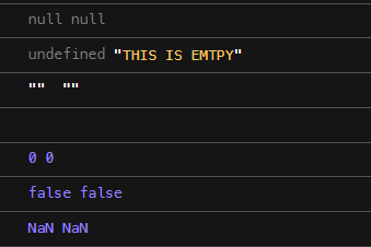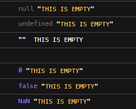 spaceVal을 제외하고는 모두THIS IS EMPTY를 출력했습니다. 논리 연산자 OR에서 null, NaN, 빈 문자열, 0, undefined, false를 모두 false로 처리한다는 뜻입니다.Default Value